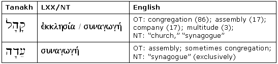 Here's a quick summary of the usage of kahal and 'edah in the LXX, NT, and English: