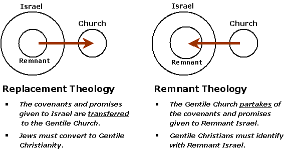 Since Replacement Theology is based on Covenant Theology, the concept of the Church takes priority over ethnic Israel, since it is claimed to have existed within Israel in the form of the believing remnant. After Jesus came, only those Jews that convert to Christianity are the legitimate "Israel of God."  Remnant Theology, on the other hand, is dispensational in outlook, but understands that Gentile Church is a new creation that is grafted into the covenants and blessings given to Remnant Israel: