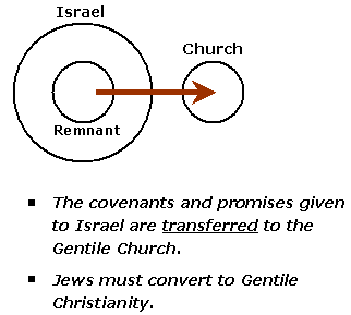 Replacement Theology claims that the Church is a "new and improved" Israel, better than the older tribal "version" revealed in the Old Testament.  In ancient times the "church" (ekklesia, ek- + kaleo, "called out ones") was indeed national Israel, but after Jesus' universal message of love was rejected by the Jews, God transferred all the covenants and promises from them to the Christian Church.  The "New Covenant" given to Israel (Jer. 31:31-37) was therefore fulfilled through the Christian Church.  This view is called "Replacement Theology" because the Christian Church now replaces national Israel as the true ekklesia of God. "For not all who are descended from Israel belong to Israel" (Rom. 9:6). Because of their disobedience (i.e., the rejection of the "new covenant" and the rule of Jesus), Israel is no longer a "chosen nation" with any special status or future.  As Martin Luther said, since the Jews rejected Christ, the only thing left to them are the curses found in the Bible, but none of the blessings. Therefore all the promises about Israel being regathered, restored, and delivered from her enemies in a coming Kingdom Age are to be allegorized (and transferred) to the Church. And since Jesus now (symbolically) reigns from the throne of David, the Church's mission is to "usher in" the Kingdom of God upon the earth by means of the worldwide spread of the gospel.  At the end of the age, Jesus will return to separate the "sheep from the goats" (Matt. 25:32-33) and the eternal kingdom of God will prevail forever.