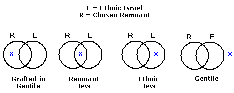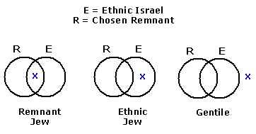 As can be seen from this diagram, a person can be 1) outside of relationship to Israel altogether (i.e., a Gentile); 2) within ethnic Israel by virtue of birth (to a Jewish mother); or 3) within both ethnic Israel (i.e., of Jewish lineage) and part of the faithful remnant (as a Jew who trusts the God of Israel). (Logically, there is a fourth option here which will be discussed below). These distinctions are important because there are many who oversimplify the matter and confuse ethnic Israel with the "remnant of Israel chosen by the grace of God" (Rom. 11:5).