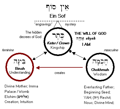 The sefirah (attribute) of Chokhmah (חָכְמָה), "Wisdom," represents the beginning of God's self-conscious mind (nous) within creation. Chokhmah is the first sefirah on the right (i.e., masculine) side of the Tree of Life. The Zohar interprets Job 28:12 ("From whence (me'ayin, מֵאַיִן) shall wisdom (חָכְמָה) be found?") to mean literally from Ayin (אַיִן) is wisdom derived. In other words, Chokhmah "flows from" Keter as God's first revealed attribute beyond His brute will to create. Here is another depiction of this idea: