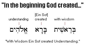 Now what is ironic about all this is that the Kabbalists do precisely what the Talmud claims was expressly forbidden by God. According to the Zohar, the word Elohim is to be understood as a direct object, not as the subject of the verb bara. Thus the Kabbalists maintain that "In the beginning God created..." should be translated as "with wisdom Ein Sof (the unexpressed subject of the verb) created Elohim. It should be clear that this is a classic example of "reading into" the text ideas that simply are not present.