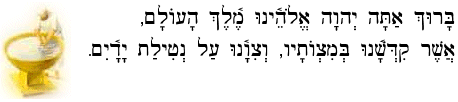 The ritual of netilat yadayim is actually a "ceremonial" cleansing. In fact, before engaging in this ritual, your hands should already be clean! Once your hands are clean, you fill a smooth-rimmed jug or glass with water, and pour it over your hands. Certain Rabbinical authorities state that you should pour the water three times on each hand - right, left, right, left, right, left. After "washing" the hands, they are clasped together and the blessing is recited.