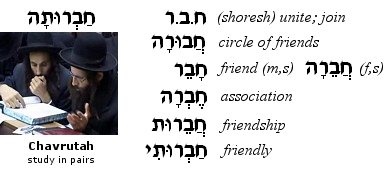 (KHEV-rah) n. Society; association. A Chevrah Kadishah is a burial society; sociology is called torat-ha'chevrah. A chevrayah is a group of friends.