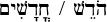 (kha-dash) 1) v. to be new (as grain), to renew (as the moon), etc. The word chodesh (month) comes from the same root as chadash (חָדַש×). 2) adj. new; renewed. 3) n. In Rabbinical Judaism, chadash refers to "young grains" that are not to be tithed, as opposed to yashan which are grains ready to be eaten according to kosher law.