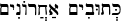 (ah-kha-RON ah-kha-RON kha-veev) phrase: "Last but not least," or better: "The last is the best of all." Sample sentence: "Abraham, Isaac, Jacob, Joseph, Moses, Joshua, Samuel, David, and acharon acharon chaviv Yeshua the Messiah and King."