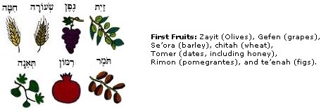 (shee-vat ham-mee-NEEM) n. שִׁבְעַת הַמִּינִים "The Seven Species." Seven types of fruits and grains enumerated in the Torah (Deut. 8:8) as being special products of the Land of Israel. Sometimes referred to as bikkurim, since the first fruits of these species were to be consecrated to the LORD as a token of appreciation for the care of the Promised Land. See the articles on Shavuot for additional information, as well as parashat Ki Tavo.