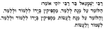 "Rabbi Yismael bar Rabbi Yose said, 'One who studies [Torah] in order to teach is given the means to study and to teach; and one who studies [Torah] in order to do is given the means to study and to teach, and to guard and to do.'"