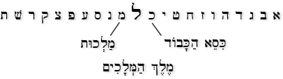 Since Lamed towers over the other letters from its central position, it is said to represent melekh hamelakhim, the King of Kings. This idea is supported by the idea that the preceding letter stands for kisei hakavod, "the throne of Glory," and the following letter stands for malkhut, "kingdom." The sages also point out that the three central letters can spell the word melekh, King.