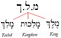Observe that the three words shown (melekh, malkhut, and malakh, respectively) all derive from the same shoresh (Mem, Lamed, Kaf). Identifying the shoresh of a given word is one of the fundamental tasks you will face as you begin to read Hebrew with comprehension.