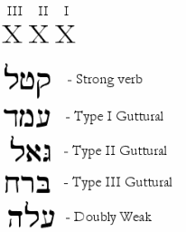 7. Strong/Weak Verbs - As mentioned above, verbs can be either strong or weak. A strong verb has all regular consonants in its stem; a weak verb has one (or more) guttural letters as part of its stem.