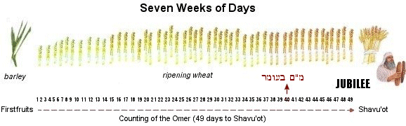 We are in the midst of the 49 day "countdown" that runs from the day following the Passover until the day before the holiday of Shavuot ("Weeks" or "Pentecost"). This seven week period is called "Counting the Omer" (ספירת העומר) in Jewish tradition (Lev. 23:15-16). During the Temple period, on each of these days an appointed priest would wave a sheaf (omer) of barley before the LORD as a symbolic gesture of dedicating the coming harvest to Him. This ceremony was called tenufat ha-omer ("waving of the sheaf").  On the 50th day, however, a sample of the first crop of the wheat harvest was baked into two loaves of leavened bread (called "Shtei Ha-Lechem," שׁתי הלחם) and waved before the altar as the climactic rite of the season (Lev. 23:15-20). Notice that this was the only time that otherwise forbidden leaven was used by the priests for the avodah (see Lev. 2:11).