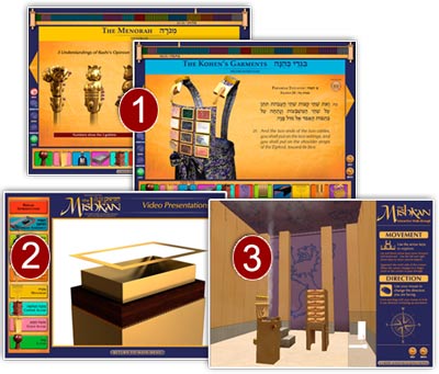 See detailed photo-realistic images, including dimensions and alternate opinions. Watch the Torah verses come to life through animation. Watch the Mishkan being assembled before your very eyes! You can even rotate 3D models of the sacred vessels and "zoom in" for a close-up view!