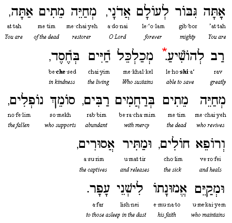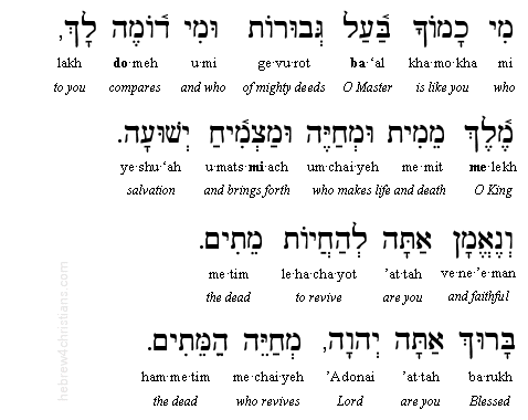 "You, O Lord, are mighty forever, You are the Reviver of the dead, You are greatly able to save.* You sustain the living in love, You revive the dead with great mercies, You support the falling, heal the sick, set free the prisoners and sustain faith for those who sleep in the dust. Who is like You, O Master of mighty deeds? Who compares to You -- a king who puts to death and restores to life, and brings forth salvation? And You are faithful to revive the dead. Blessed are You, O Lord, who revives the dead."