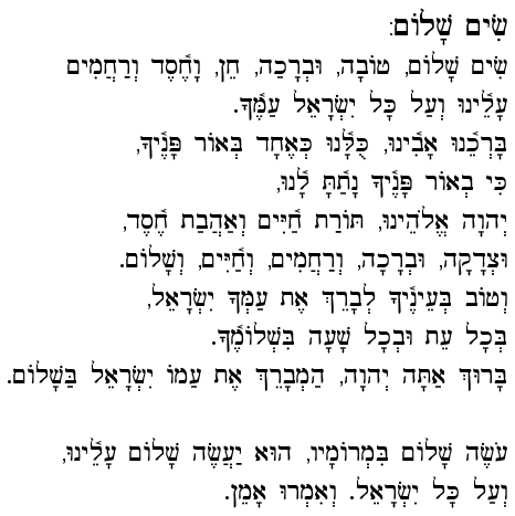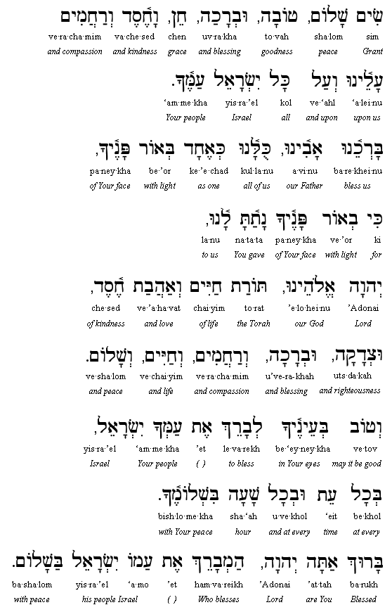 "Grant peace, goodness, blessing, grace, kindness, and compassion upon us and upon all of Your people Israel. Bless us, our Father, all of us as one, with the light of Your face, for with the light of Your face You gave to us, Adonai our God, the Torah of life and love of kindness, righteousness, blessing, compassion, life, and peace. And may it be good in Your eyes to bless Your people Israel at every time and at every hour with Your peace. Blessed art You, Lord, Who blesses His people Israel with peace."