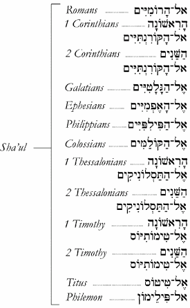 Letters of Paul ("Pauline Epistles") There are thirteen letters from Sha'ul (Paul) the shaliach (messenger) to the Gentiles. Collectively these may be called Igerot Sha'ul Hashaliach, meaning "Letters of the messenger Paul":