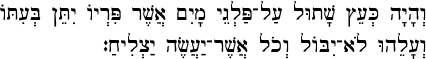 piryo yitten be'ito - will give (3ms imperf. from natan) his fruit (3ms from pri, fruit) in its season (3ms from eit, time, with prefixive bet, in). Note that fruit bearing is not constant, but according to divine timing. It takes time to acquire wisdom and other middot halev.