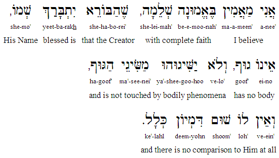 "I believe with complete faith that the Creator, blessed be His Name, has no body and is unaffected by physical phenomena, and there is no comparision to Him with anything."
