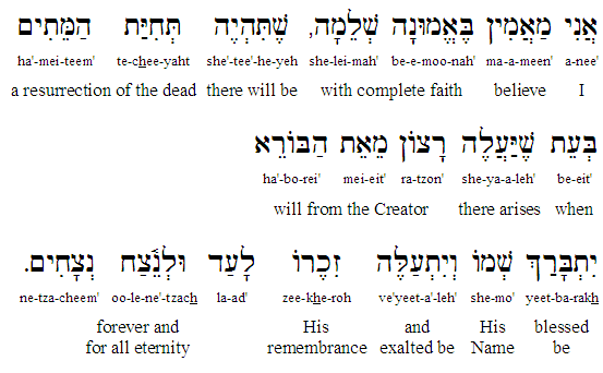 "I believe with complete faith that there will be a resurrection of the dead when the Creator so wills, blessed be His Name and exalted be His remembrance forever and for all eternity."